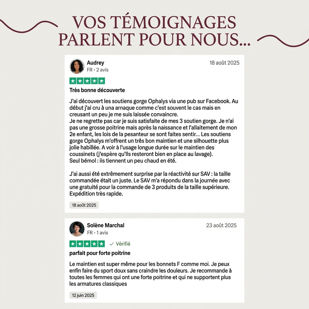 Oui, Ophalys a été validé et testé sur femmes de tout âge avec des bonnets C à G+. La poitrine est rehaussée, galbé et maintenue sans compression même en cas d’affaiblissement